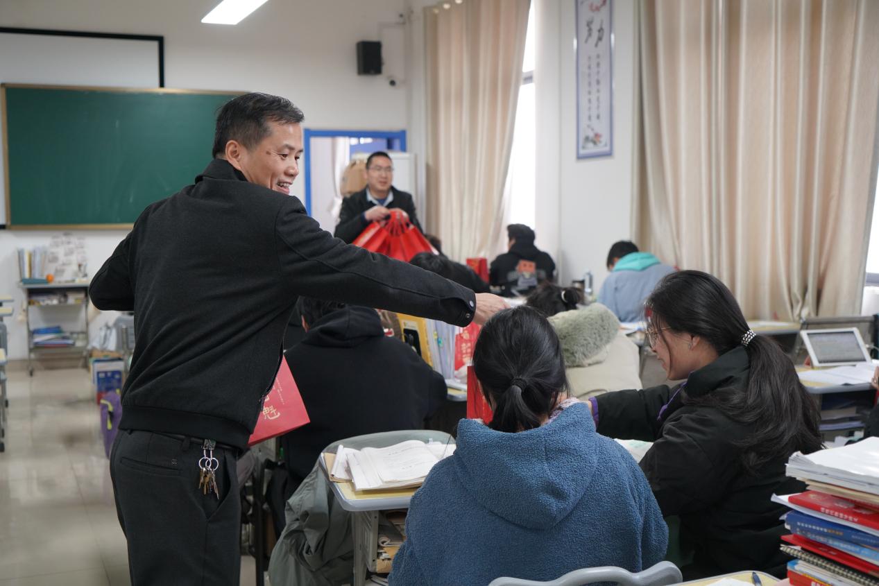 学院向考研学子发放了慰问礼包,内含保暖用品、食品补给及手写祝福贺卡等实用物品,每一份礼物都承载着学院对学生的关怀与鼓励。领取礼包的同学们面带笑容,并表示:“这份温暖让我们更有底气完成最后的冲刺!”