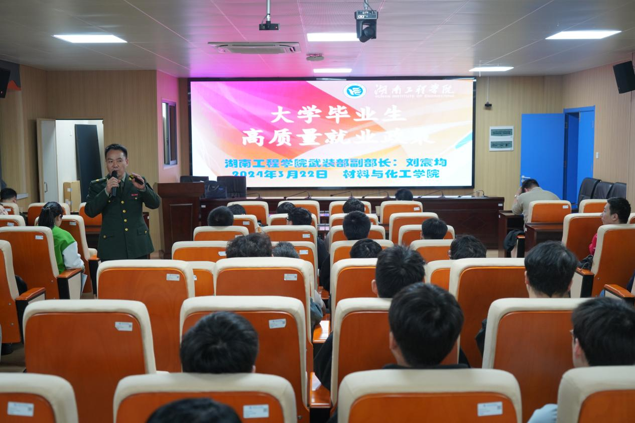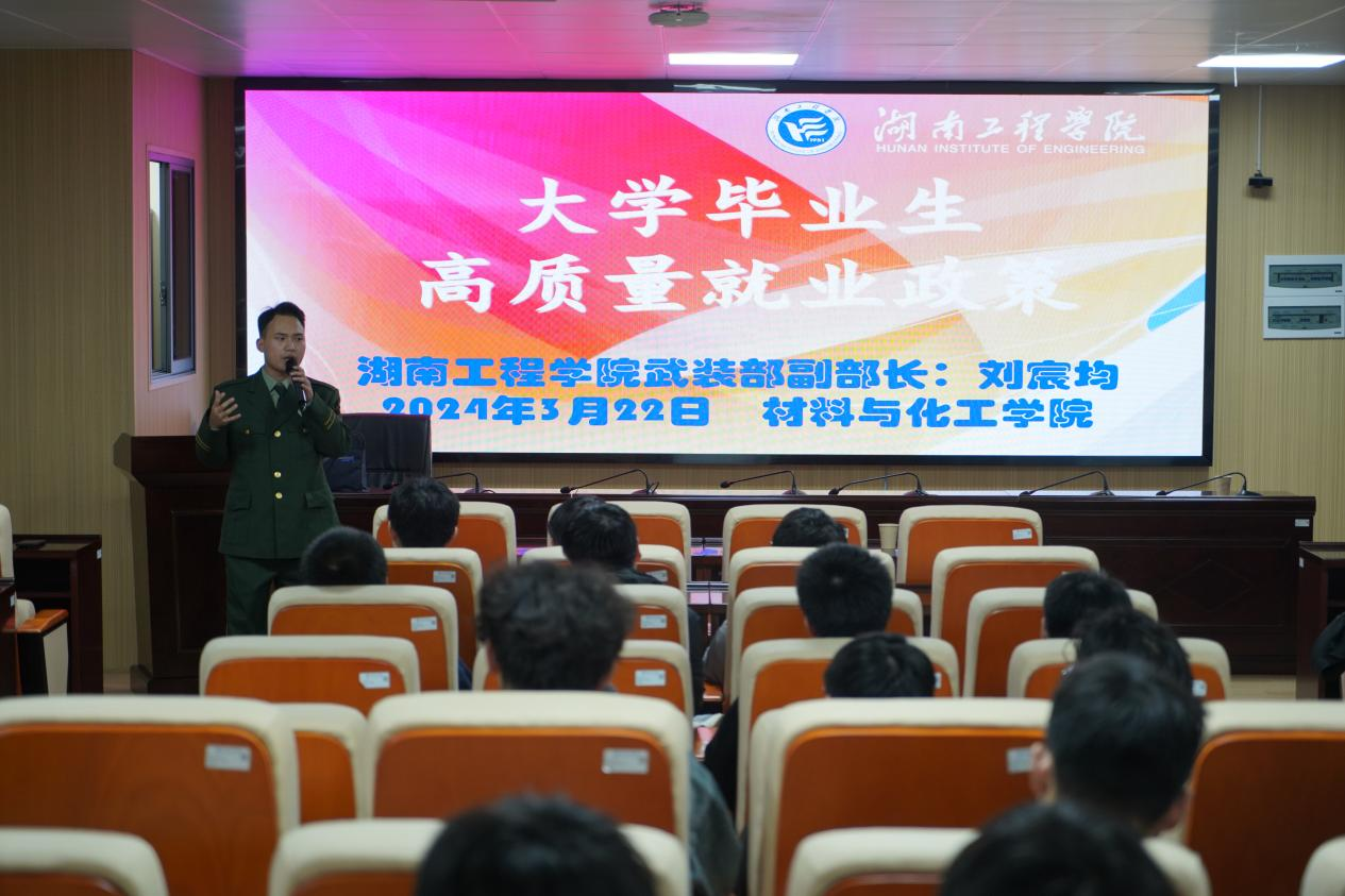 “国无防不立,民无军不安”。为深入贯彻习近平强军思想,进一步落实国家征兵要求,帮助大学生全面了解征兵政策,实现高质量就业。3月22日下午,ok138cn太阳集团529邀请我校人民武装部副部长刘宸均在材化楼A-301开展主题为“大学毕业生高质量就业政策”的主题征兵宣讲会。学院征兵专干陶庆忠、太阳成八一社团社长左清时及有入伍意向的2024届毕业生参加宣讲会。会议由ok138cn太阳集团529党委副书记罗荃主持。