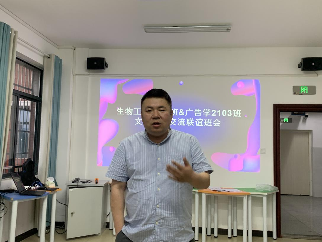 生物工程2102班班主任徐粤宇首先发言指出本次联谊班会开展的意义:其一是加强各专业之间的联系,让各位同学在大学期间结识更多志同道合的伙伴;其二是通过对不同专业的深入了解后取长补短,学习对方专业的优势,取长补短;其三是劝诫同学们珍惜大学时光,勇敢追梦,不虚度光阴,不负青春,不负韶华,砥砺前行!