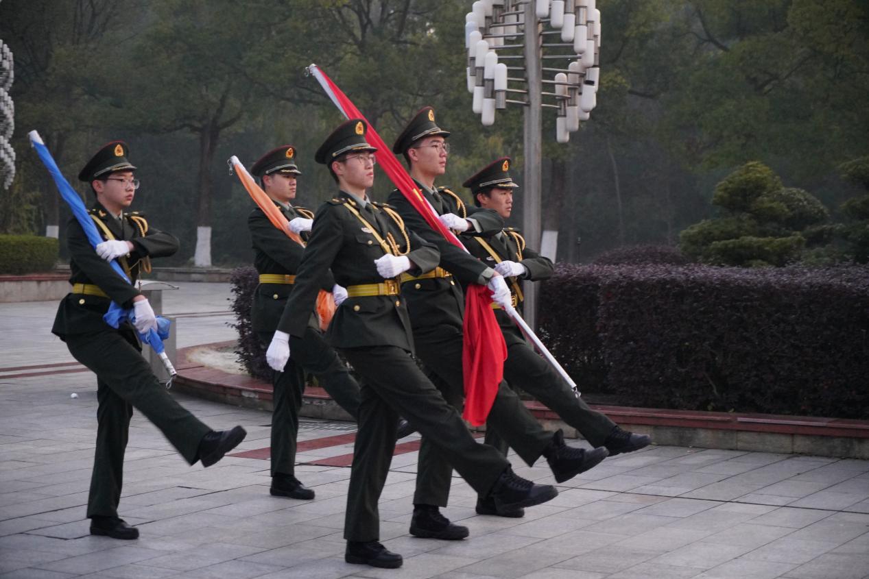 清晨7时,国旗护卫队迈着整齐有力的步伐,护送国旗至升旗台。在雄壮的国歌声中,五星红旗冉冉升起,全体师生肃立注目,表达对祖国的崇高敬意。