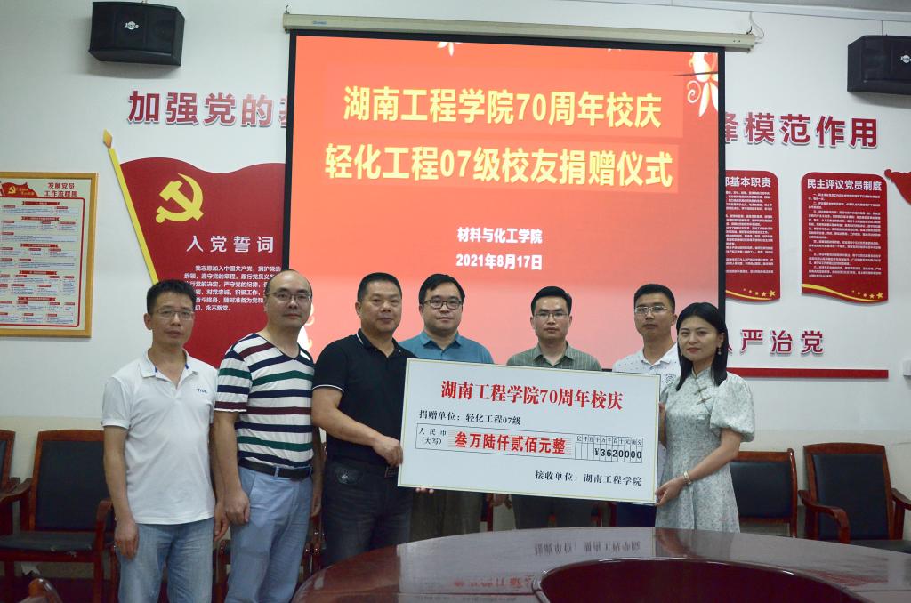 作为此次捐赠活动的组织者之一,轻化工程07级校友代表彭平说,“毕业离开学校十年,经常怀念母校的一花一草一木,感恩老师的培养,感恩母校的包容!7月底突然袭来的疫情,使得本计划好的毕业十周年聚会不得不推迟;而班主任陈镇老师将母校七十华诞、新化工大楼即将投入使用的喜讯发到班级群后,大家热血沸腾,纷纷表示要将十年聚会的激情转化为感恩母校的实际行动;很快,两个班就有67位同学进行了捐款,共筹得36200元,为母校、学院发展尽献绵薄之力。”彭平继续说,“其实,每位校友都非常关注学校、学院的发展,经常看学校、学院的网页新闻,校友们坚信,在学校党委、行政的坚强有力领导下,太阳成、ok138cn太阳集团529一定好发展得越来越好!同时,校友们也会更加密切地关注与支持学校、学院的发展。”
